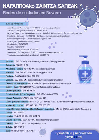 Iruñeko alde zaharraz gain, beste hamar auzotan ere martxan jarri dira zaintza sareak Iruñean. Lanak «gertutasunaren arabera» esleitzen dira, eta adineko pertsonak izaten dira gehienetan zerbitzu honen erabilera egiten dutenak. Zaintza sareko kideak dio «erosketak egitea, farmaziako botikak erostea eta zaborra botatzea» izaten direla jasotzen dituzten eskera gehienak. Orain, deseskalda fase honetan ere, martxan daude noski zaintza sareak.