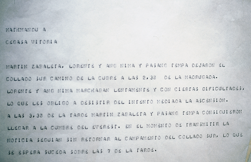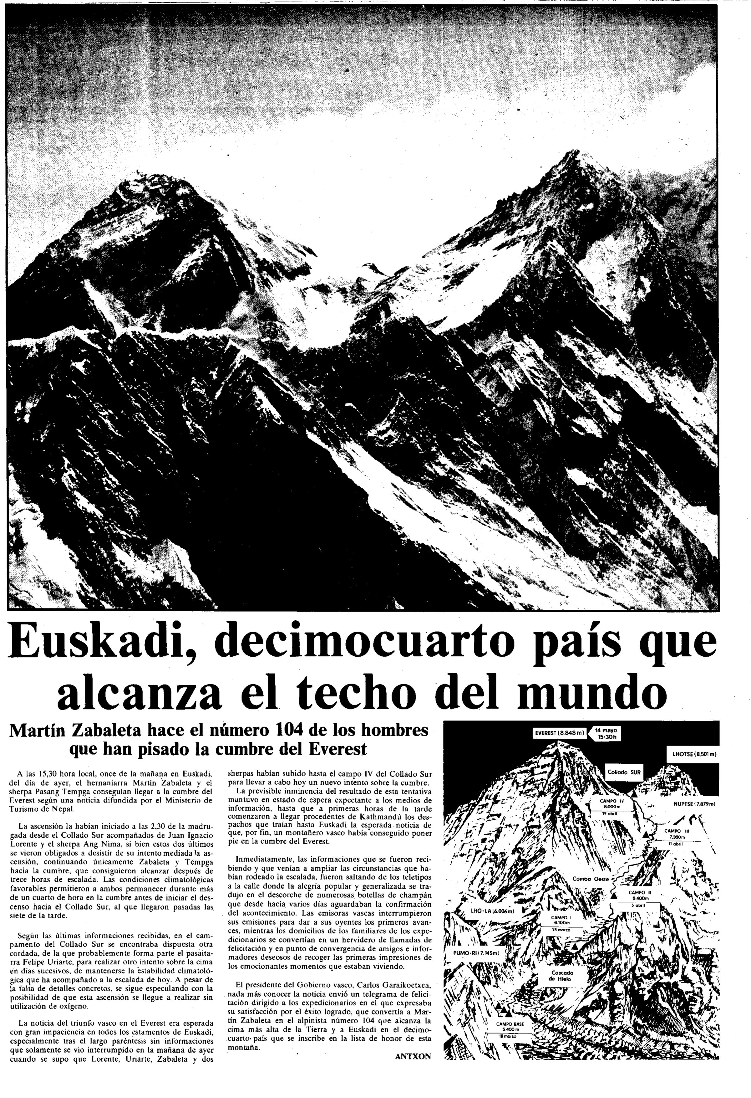 Antxon Iturrizaren sinadura zeramaten kronikek eman zuten, besteak beste, Everesteko balentria haren berri. Orain ez bezala, informazioaren zabalpenak denbora luzea behar zuen. Astebete inguru behar izaten zuten Euskal Herrian Himalaiako berri jasotzeko. Hala ere, gailurraren egunean, Everesten bertan beste espedizio batek zuen irrati bati esker, lau orduan Cegasaren Gasteizko bulegoetara iritsi zen despatxu historikoa, «... a las 3.30 de la tarde Martin Zabaleta y Pasang Tempa consiguieron llegar a la cumbre del Everest».